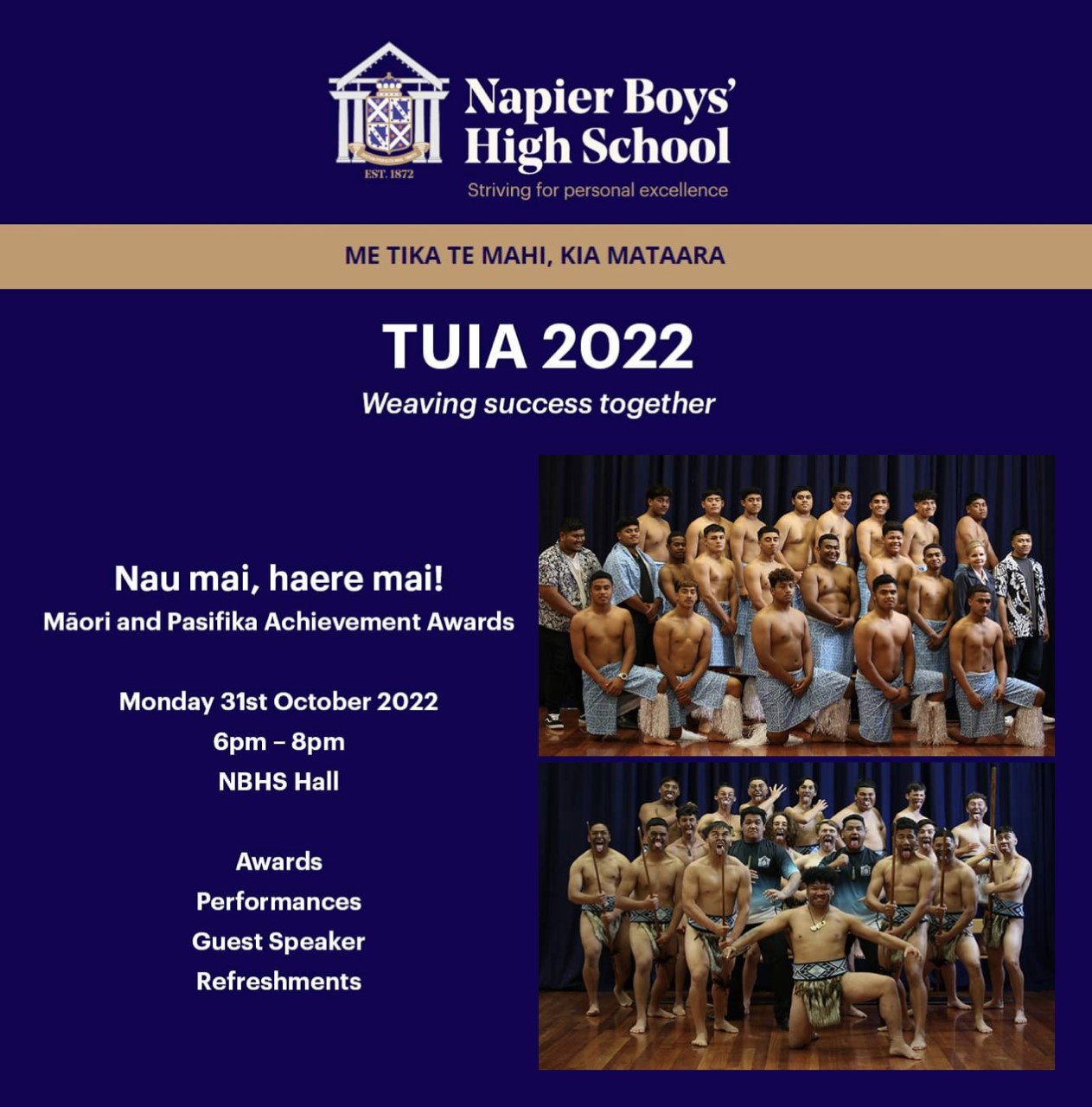 You and your whānau are invited to come celebrate our TUIA 2022 Awards night, where many of our Māori and Pasifika students will be acknowledged, recognised and celebrated for their efforts and energy in their learning journeys here at Napier Boys’ High School.